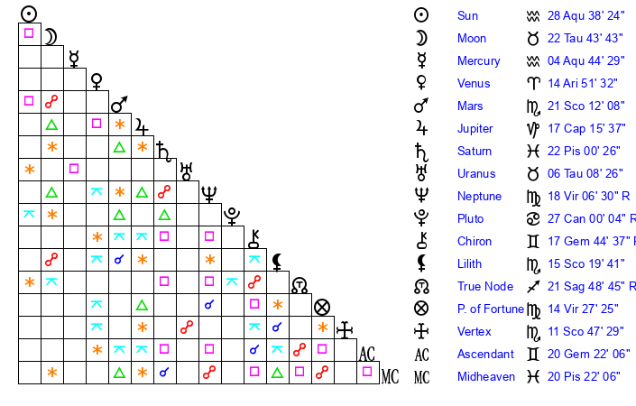 | Sun | 28 Aquarius 38 | 29 Aquarius 17 | 25 Taurus 23 |