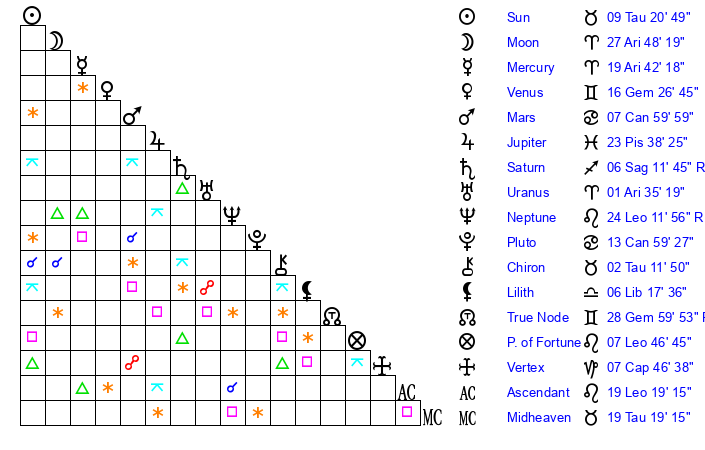 | Sun | 9 Taurus 21 | 10 Taurus 36 | 13 Leo 13 |