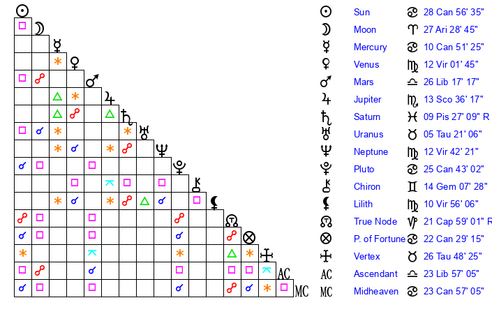 | Pluto | 25 Cancer 43 | 2 Aquarius 38 | 27 Cancer 23 |