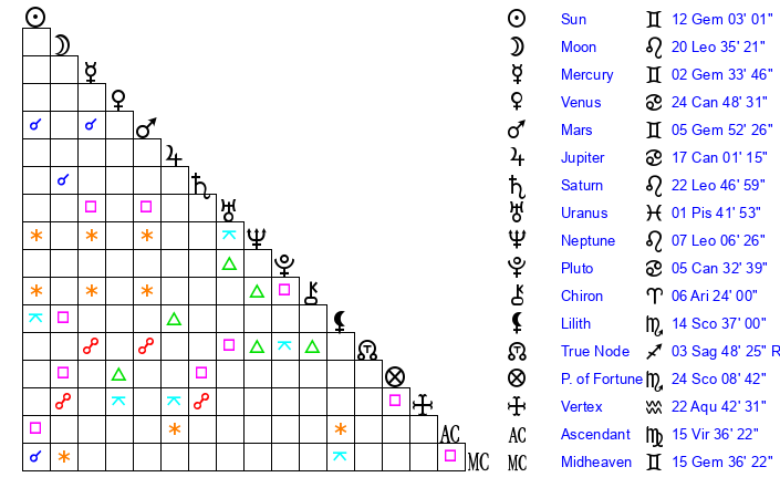 | Moon | 20 Leo 45 | 19 Virgo 43 | 4 Cancer 7 |