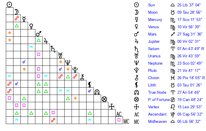 Uranus | 26 Virgo 48 | 26 Taurus 22 | 29 Virgo 6 |