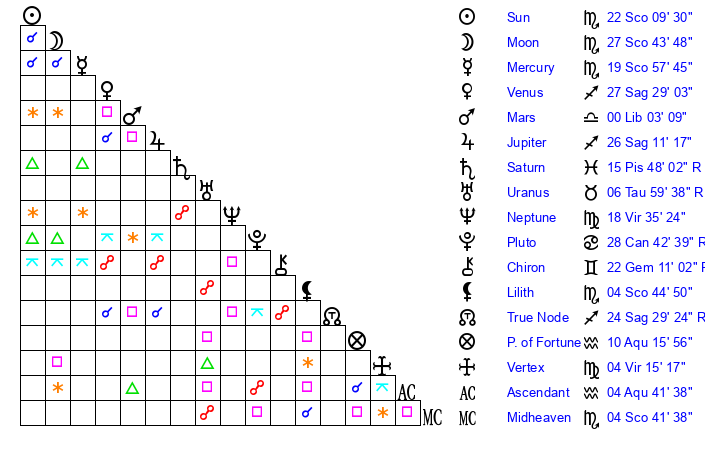 | Moon | 27 Scorpio 49 | 21 Virgo 26 | 27 Aquarius 35 |