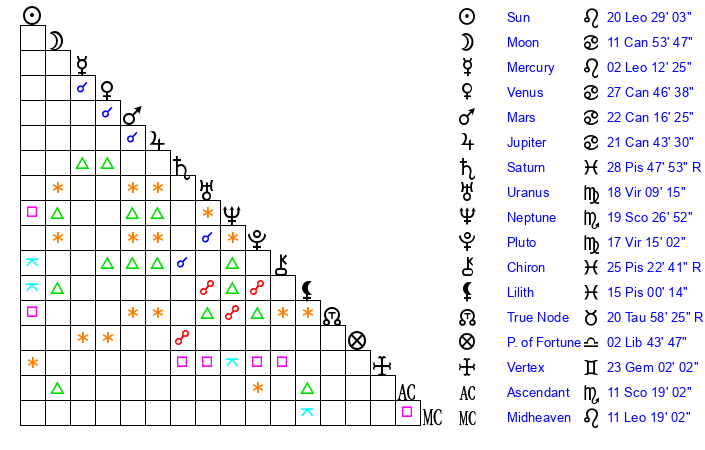 Moon | 11 Cancer 50 | 17 Aries 50 | 13 Virgo 21 |