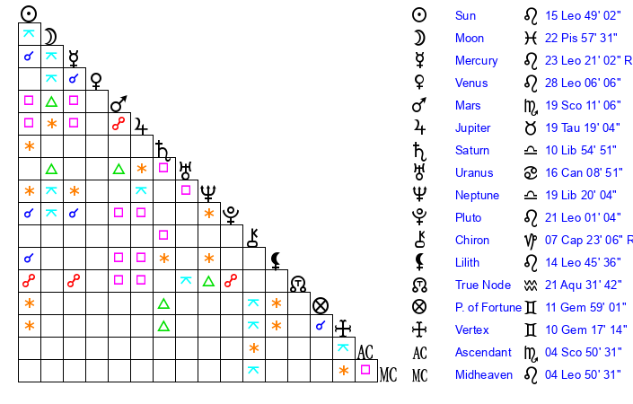 | Mercury | 23 Leo 21 | 4 Leo 41 | 13 Scorpio 33 |