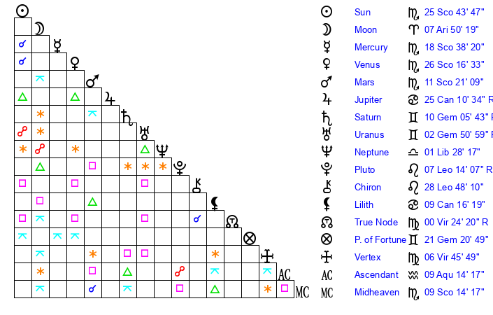 | Moon | 7 Aries 47 | 9 Scorpio 28 | 22 Aries 44 |