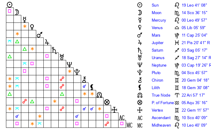 | Moon | 14 Scorpio 35 | 3 Aries 42 | 27 Aries 6 |