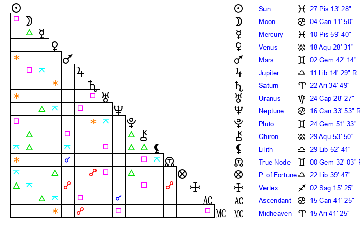 | Sun | 27 Pisces 14 | 28 Pisces 21 | 18 Cancer 29 |
