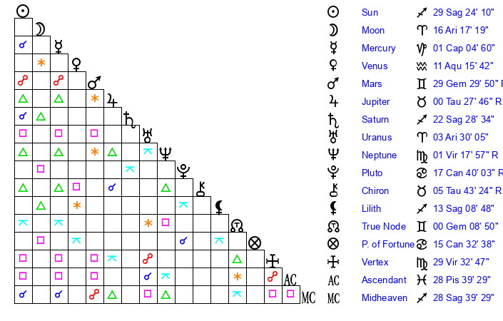 | Moon | 16 Aries 24 | 14 Virgo 30 | 2 Scorpio 5 |