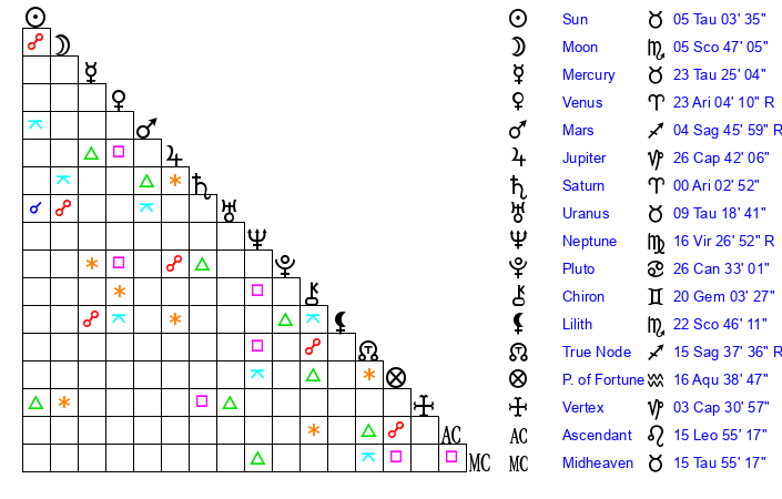 | Sun | 5 Taurus 3 | 5 Taurus 44 | 29 Cancer 26 |