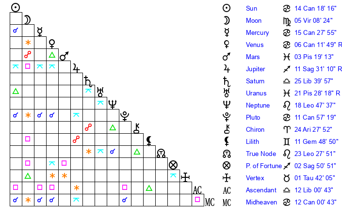 | Moon | 5 Virgo 12 | 27 Scorpio 25 | 24 Taurus 48 |