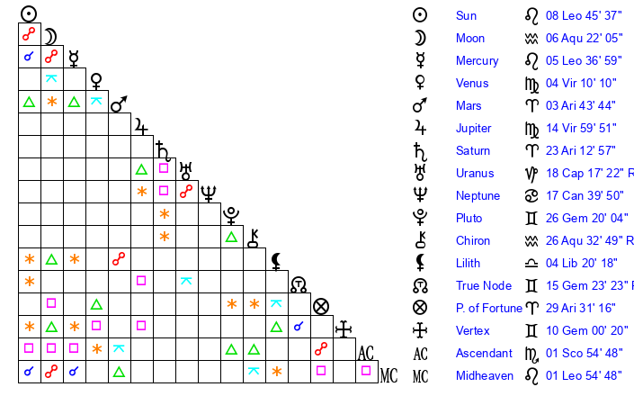 | Pluto | 26 Gemini 20 | 2 Aquarius 24 | 26 Gemini 18 |