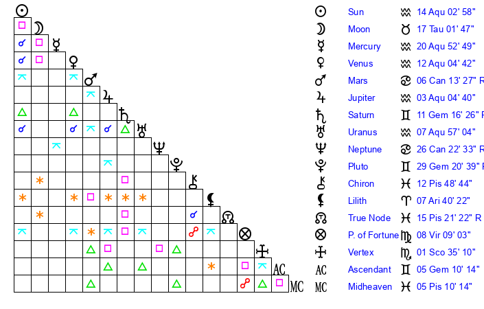 | Sun | 14 Aquarius 3 | 15 Aquarius 7 | 3 Gemini 37 |