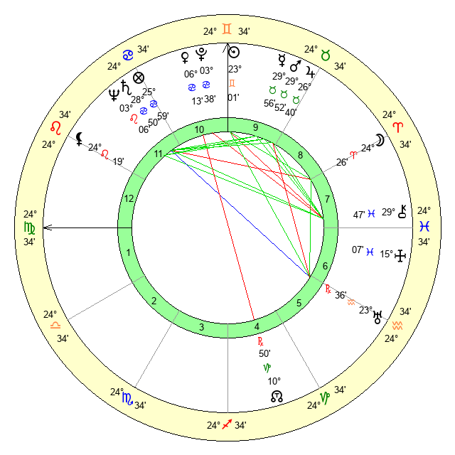 | Sun | 23 Gemini 1 | 23 Gemini 53 | 6 Libra 57 |