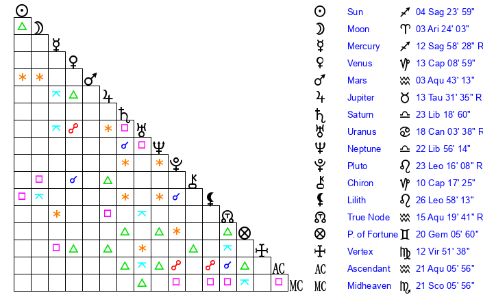 | Sun | 4 Sagittarius 24 | 4 Sagittarius 41 | 18 Aquarius 38 |