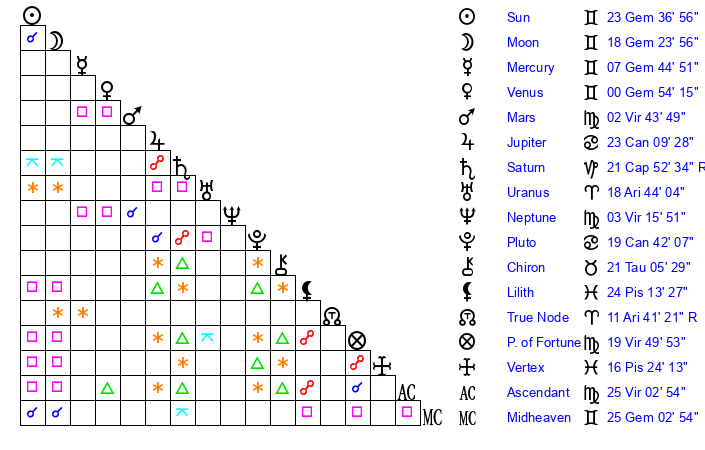 | Sun | 23 Gemini 37 | 24 Gemini 50 | 23 Virgo 50 |