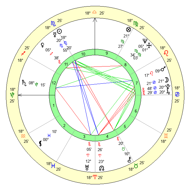 | Moon | 21 Cancer 13 | 9 Leo 47 | 20 Capricorn 39 |