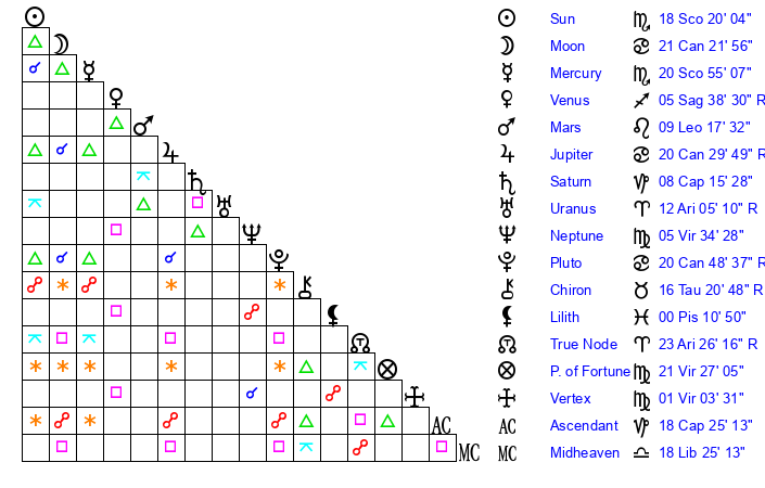 | Sun | 18 Scorpio 20 | 19 Scorpio 18 | 24 Aquarius 48 |