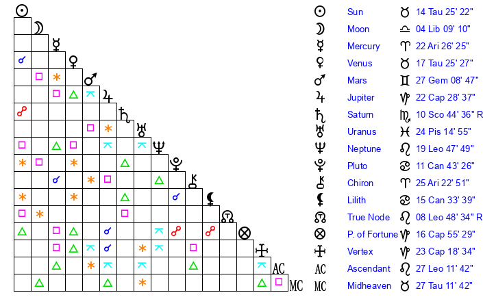 | Moon | 4 Libra 5 | 25 Leo 36 | 13 Gemini 50 |
