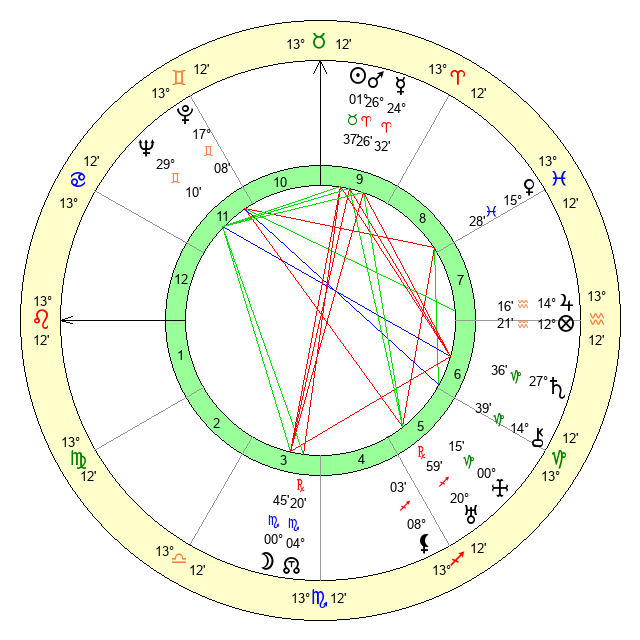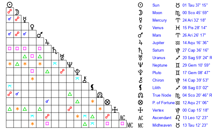 | Moon | 0 Scorpio 38 | 22 Aquarius 59 | 24 Aries 4 |