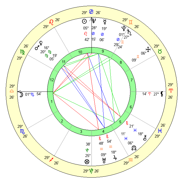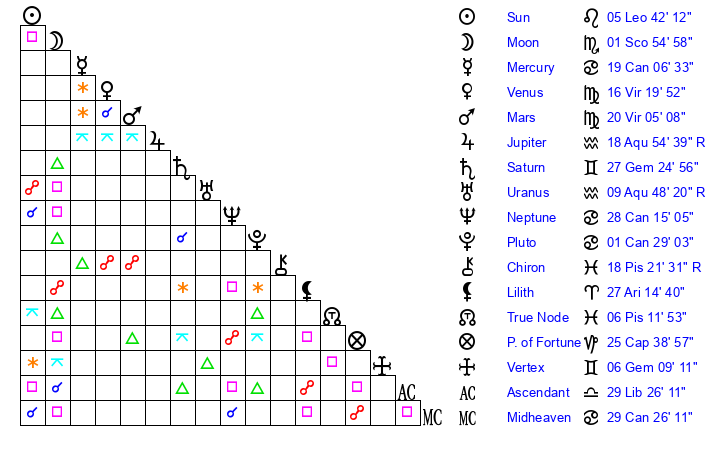 | Mercury | 19 Cancer 6 | 10 Leo 41 | 7 Scorpio 5 |