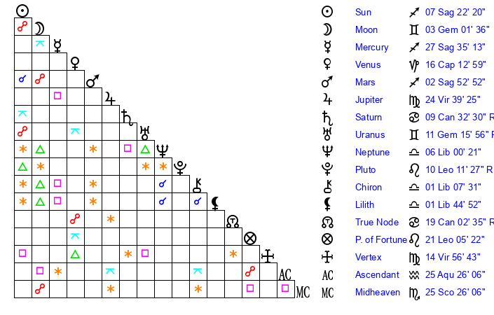 | Sun | 7 Sagittarius 22 | 7 Sagittarius 43 | 29 Aquarius 42 |