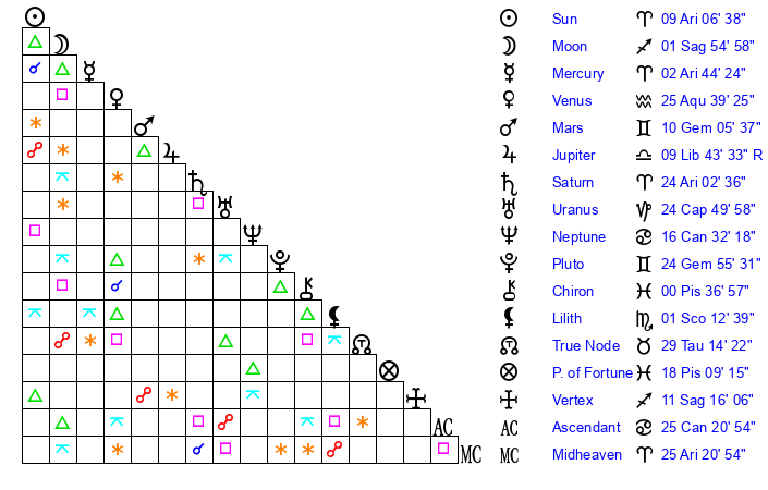 | Moon | 1 Sagittarius 49 | 27 Aries 55 | 16 Aquarius 34 |
