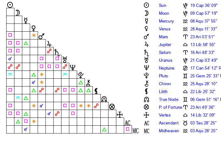 | Sun | 19 Capricorn 36 | 20 Capricorn 42 | 14 Taurus 18 |