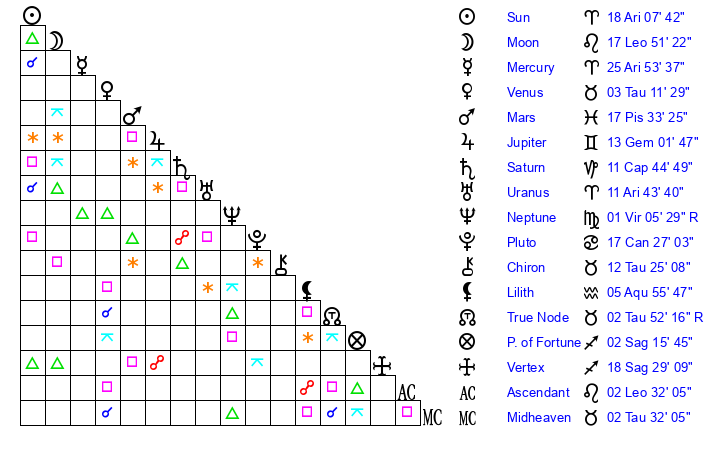 | Venus | 3 Taurus 12 | 25 Pisces 1 | 27 Leo 42 |