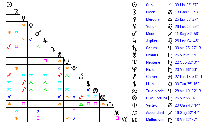 Mercury | 26 Libra 56 | 15 Libra 53 | 13 Scorpio 54 |