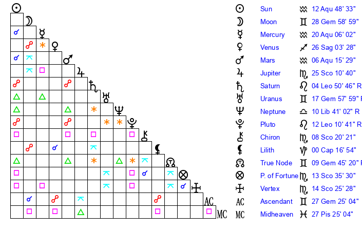 | Neptune | 10 Libra 41 | 28 Pisces 0 | 8 Libra 52 |