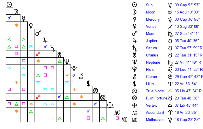 | Mars | 27 Scorpio 14 | 12 Capricorn 28 | 25 Capricorn 18 |