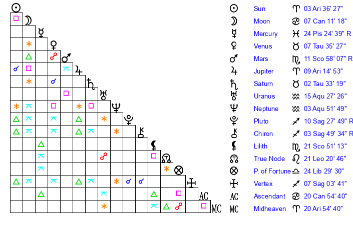 Sun | 3 Aries 37 | 4 Aries 18 | 29 Aries 12 |