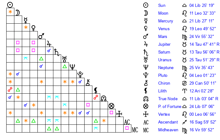 | Moon | 11 Leo 28 | 9 Sagittarius 37 | 24 Virgo 56 |