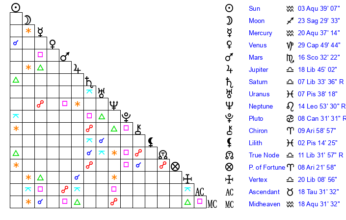 | Saturn | 8 Libra 15 | 16 Pisces 33 | 2 Libra 9 |