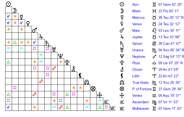 | Sun | 1 Gemini 42 | 1 Gemini 51 | 18 Cancer 32 |