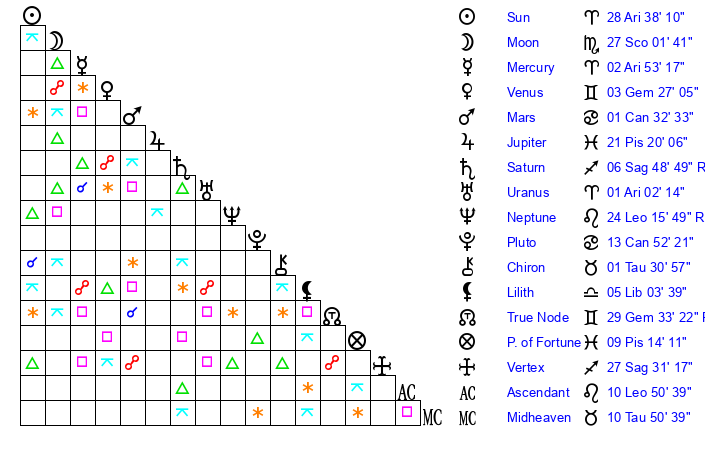 | Moon | 27 Scorpio 5 | 13 Capricorn 43 | 7 Cancer 55 |