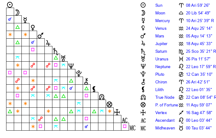 | Moon | 20 Libra 59 | 24 Aries 8 | 15 Gemini 28 |