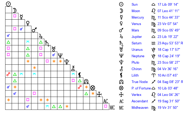 | Sun | 17 Libra 9 | 17 Libra 24 | 19 Scorpio 4 |