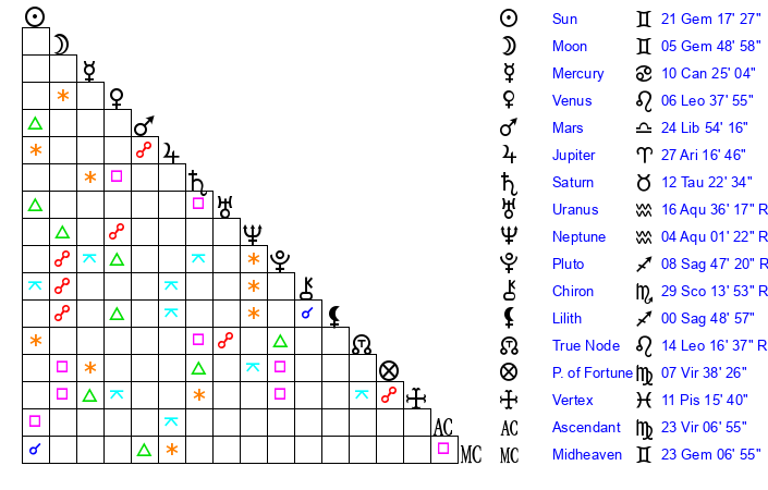 Sun | 21 Gemini 17 | 21 Gemini 58 | 16 Cancer 6 |