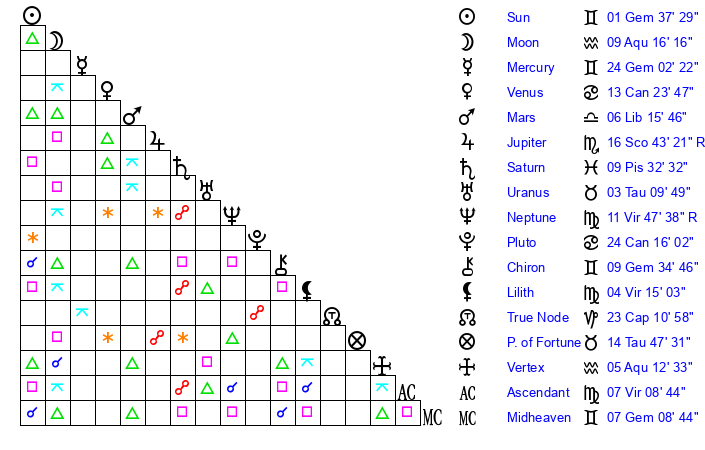 | Moon | 9 Aquarius 16 | 14 Aries 51 | 4 Gemini 45 |