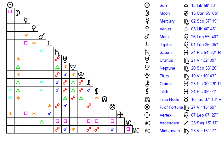 Sun | 13 Libra 58 | 14 Libra 55 | 12 Sagittarius 6 |