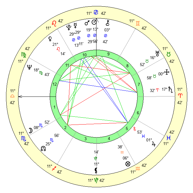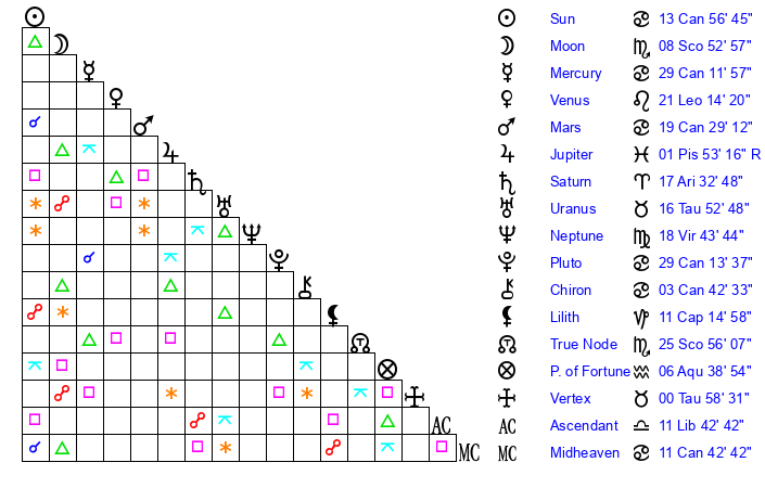 | Sun | 13 Cancer 56 | 14 Cancer 52 | 7 Libra 51 |