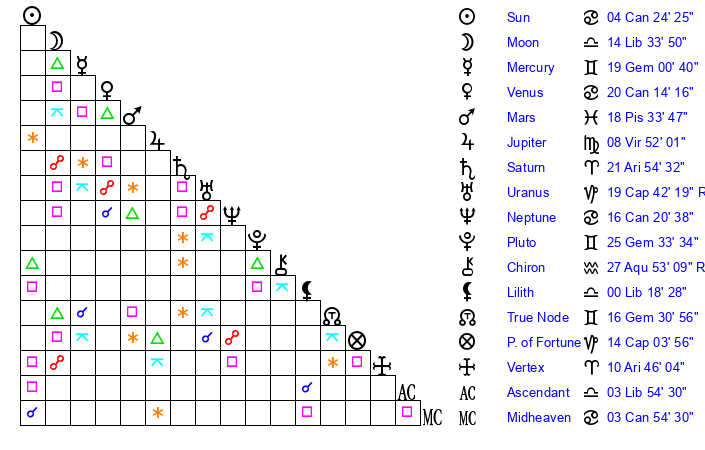 | Moon | 14 Libra 34 | 22 Cancer 20 | 7 Capricorn 34 |