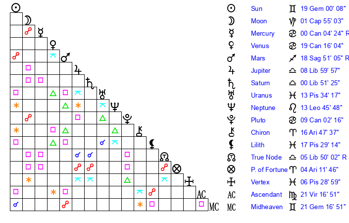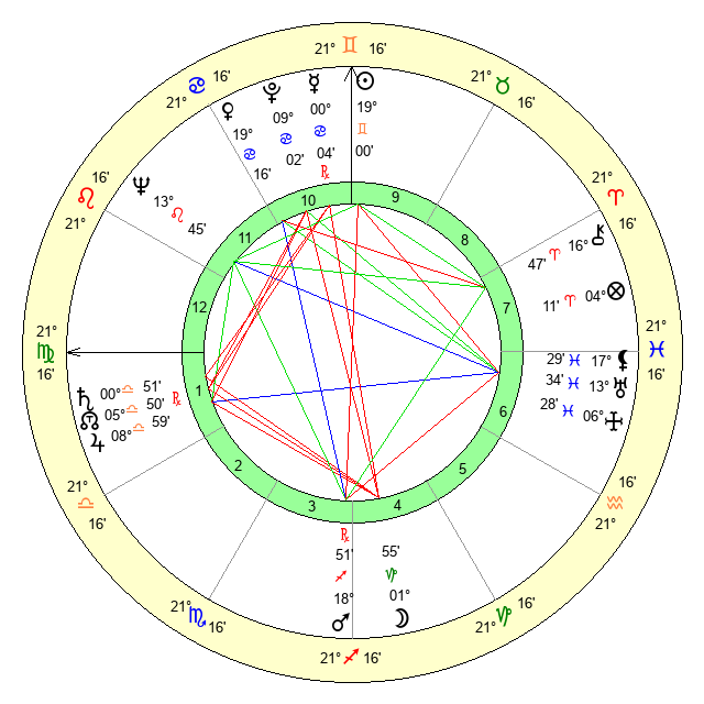 | Sun | 19 Gemini 0 | 20 Gemini 4 | 27 Virgo 55 |