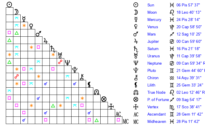 | Sun | 6 Pisces 58 | 8 Pisces 21 | 2 Cancer 1 |