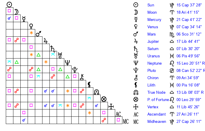 | Venus | 7 Capricorn 34 | 3 Pisces 45 | 16 Taurus 5 |