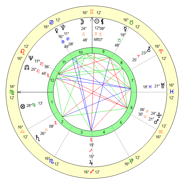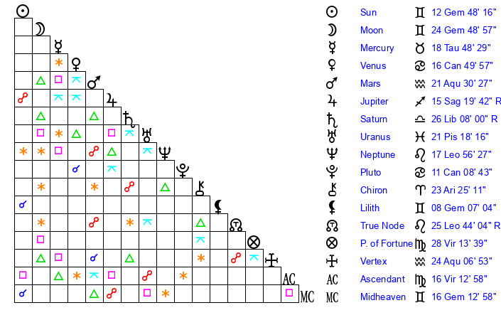 | Moon | 24 Gemini 51 | 19 Virgo 43 | 12 Pisces 15 |