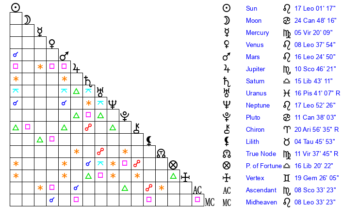 | Neptune | 17 Leo 52 | 1 Aries 49 | 20 Leo 22 |