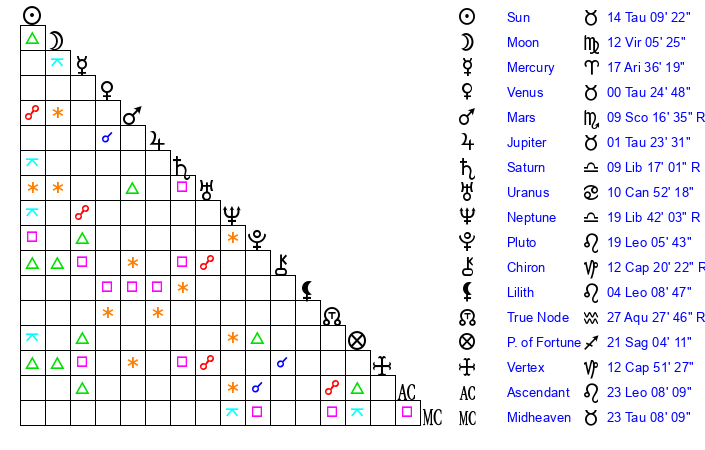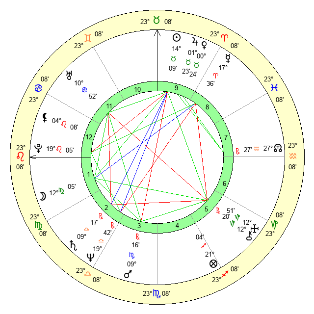 | Moon | 11 Virgo 59 | 16 Leo 8 | 24 Taurus 54 |
