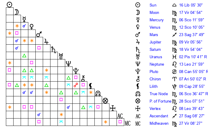 | Saturn | 19 Virgo 32 | 27 Pisces 0 | 25 Virgo 13 |